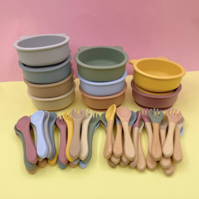 Bộ đồ ăn bằng silicon hoạt hình cho trẻ em đĩa cốc nước thìa nĩa thức ăn bổ sung cho bé bát bán buôn bát silicone cho bé sản phẩm mới