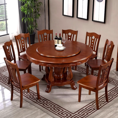 Tất cả gỗ nguyên khối Bàn ăn Trung Quốc và ghế kết hợp với bàn xoay bàn tròn lớn bàn ăn gia đình bàn ăn gỗ cao su chạm khắc cổ bàn ăn