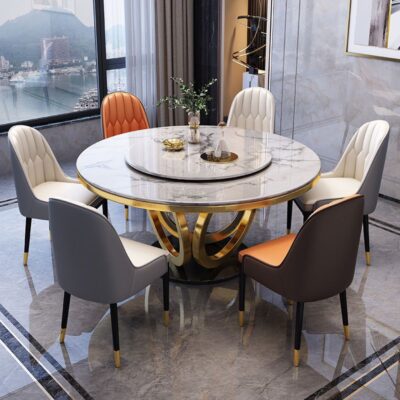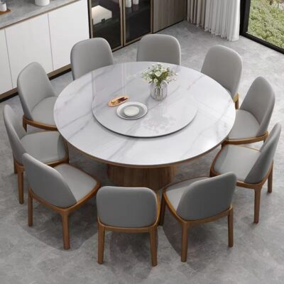 Sự kết hợp giữa bàn ghế ăn bằng đá phiến sáng bóng sang trọng và hiện đại, đơn giản, hiện đại, phòng khách lớn và nhỏ, bàn tròn với bàn ăn xoay