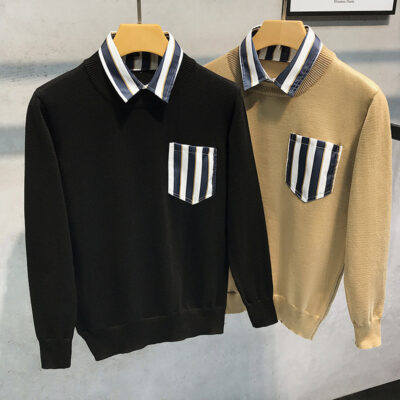 Triều Thương Hiệu Mùa Đông Mới Miếng Dán Cổ Áo Sơ Mi Nối Giả Hai Mảnh Nam Retro Áo Len Thu Đông Dệt Kim