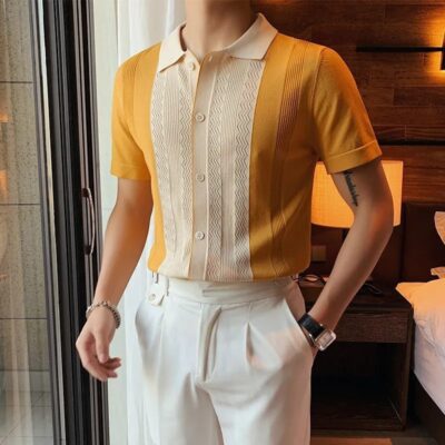 Top Nam Mùa Hè 2023 Áo Sơ Mi Dệt Kim Ngắn Tay Phong Cách Hàn Quốc Slim Breeze Rỗng Ve Áo Nửa Tay Áo Cardigan OLO Của Anh