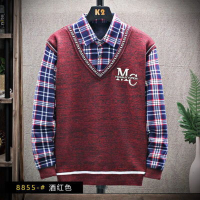 Xu hướng 2022 ins mới thời trang nam cổ áo sơ mi màu tay áo len giả 2 áo triều