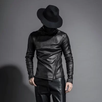 Nam Thu Đông Cổ Áo Đứng Ấm Lót Lông Cừu Áo Khoác Chui Đầu Gothic Mỏng Phù Hợp Với Punk Phối Đen Xe Máy Da PU Áo Khoác