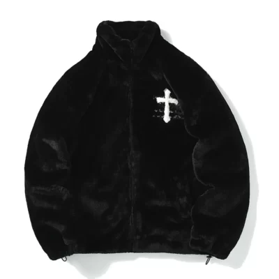 Nam Áo Khoác Lông Thú Thỏ Áo Khoác Hip Hop Chữ Thập Chữ Cái Mùa Đông Áo Khoác Nỉ Dạo Phố Cổ Bông Tai Kẹp Phối Khóa Kéo Lên Thời Trang Áo Khoác Ngoài