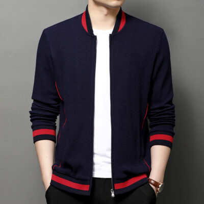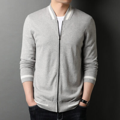 2021 Mùa Thu Đông Nam Lụa Dâu Tằm Cổ Bóng Chày Dây Kéo Áo Len Cardigan Áo Khoác Thanh Niên Hàn Quốc Áo Len Sọc