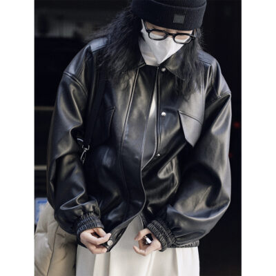 Đầu Xuân Mới Phiên Bản Hàn Quốc Đường Phố Retro Áo Khoác Da PU Phối Dáng Rộng Màu Đen Cổ Xe Máy Nữ