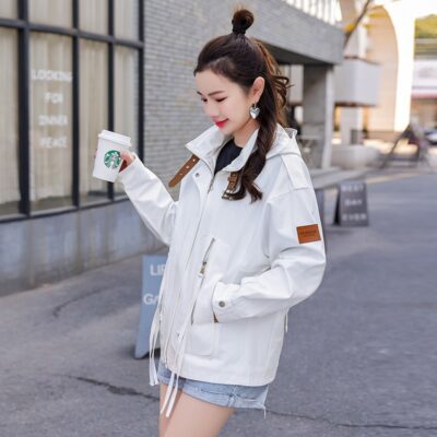 Áo khoác nữ dáng ngắn người đàn ông nhỏ mùa xuân 2023 mới áo khoác nữ áo khoác bảo hộ lao động có mũ trùm đầu thường ngày