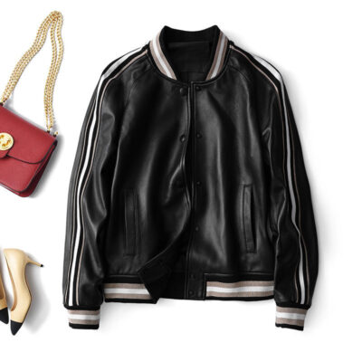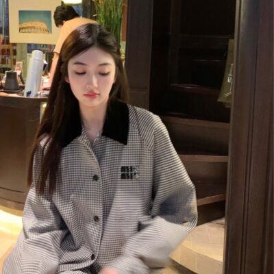 [Phiên bản chính xác] miu sê-ri cô gái cổ điển nhung cổ áo kẻ sọc đen trắng áo khoác đồng phục bóng chày