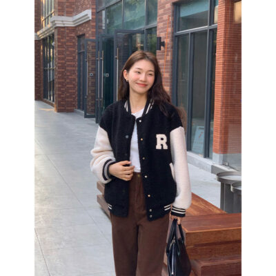 TG Cổ Điển Màu Sắc Tương Phản Retro Len Cừu Đồng Phục Bóng Chày Nữ Mùa Đông 2022 Mới Rời Chữ Áo Khoác Dày 18356
