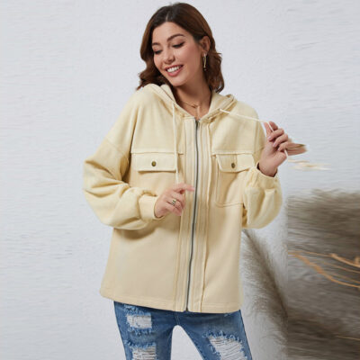 Đầu mùa thu mới màu trơn áo khoác nữ có mũ phong cách Âu Mỹ giản dị phù hợp với tất cả các trận đấu dây rút dây kéo dài tay ấm áp áo khoác nữ