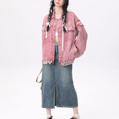 Mùa Xuân Năm 2023 Retro Bẩn Màu Hồng Áo Khoác Denim Nữ Hốc Thiết Kế Phong Cách Dân Tộc Khâu Rửa Sạch Áo Khoác Denim