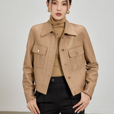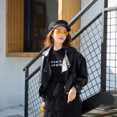 Da cừu cao cấp áo khoác da nữ mùa xuân 2023 mới phong cách xe máy áo khoác da cừu nữ áo khoác ngắn