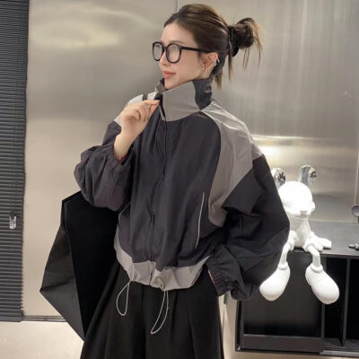 Mùa xuân năm 2023 phong cách nước ngoài cổ áo đứng phối màu tương phản khâu áo khoác ngắn thời trang nữ dây rút áo khoác áo khoác top ins