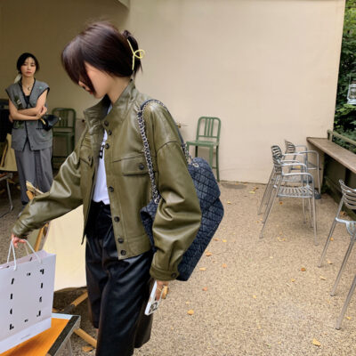 Hình chụp thật của áo khoác da pu cổ đứng mới màu xanh lá cây phong cách cổ điển dành cho nữ mùa xuân và mùa thu ngắn phần ngọn áo khoác biker nhỏ
