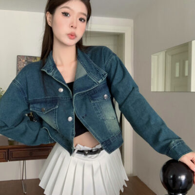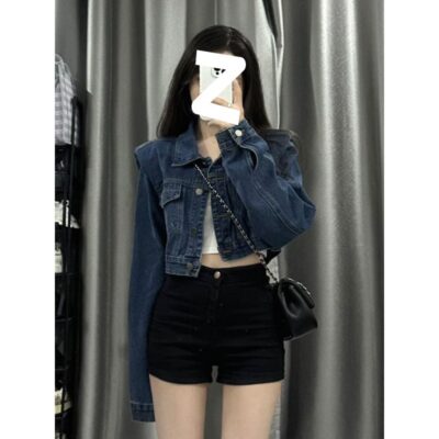 Áo khoác ngắn denim mùa xuân mới ngọt ngào mát mẻ đệm vai áo khoác ngắn nữ phiên bản Hàn Quốc phong cách Hồng Kông phù hợp với áo khoác hàng đầu triều
