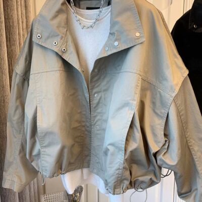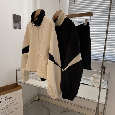 Màu sắc tương phản nối dây rút thắt lưng giản dị cổ đứng dây kéo áo sơ mi nữ rộng rãi phù hợp với áo khoác áo khoác áo khoác ngắn chống gió
