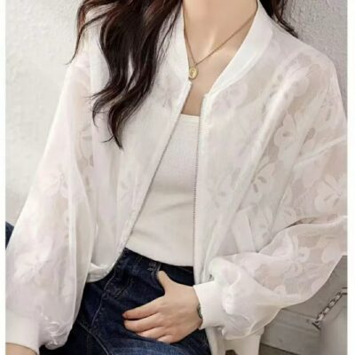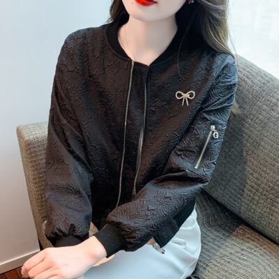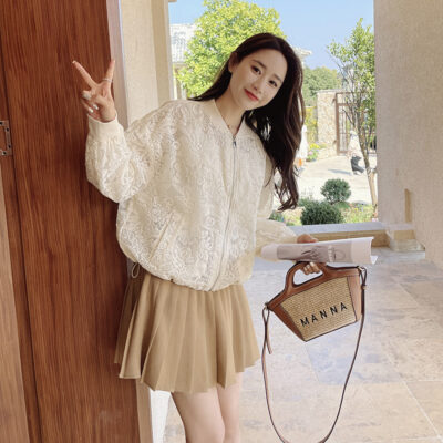 Áo khoác ngắn ren khoét lỗ quần áo nữ xuân thu 2023 phong cách mới nóng bỏng cổ đứng rời đồng phục bóng chày cardigan quần áo chống nắng