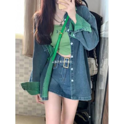 Áo khoác denim màu xanh lá cây theo phong cách Hồng Kông của Mỹ, áo khoác denim nữ đầu mùa thu rộng thời trang thường ngày phù hợp với tất cả các trận đấu dài tay hàng đầu