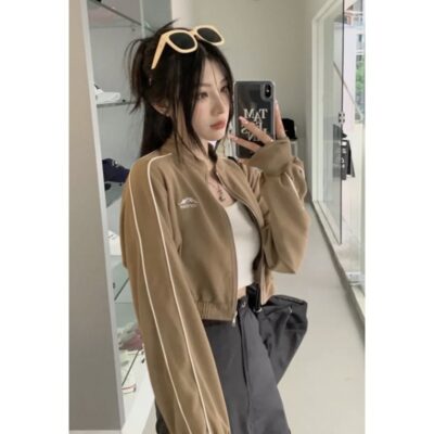 Thêu Chữ Mỹ Màu Sắc Tương Phản Eo Áo Khoác Ngắn Áo Khoác Retro Cổ Dây Kéo Đôi Cardigan Áo Khoác Nhỏ Nữ