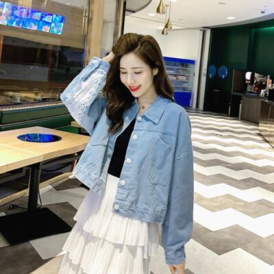Rất thần tiên áo khoác denim nữ ngắn dáng rộng xuân thu mới nhỏ tươi thời trang phối ren áo khoác hàng đầu triều