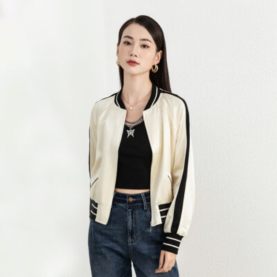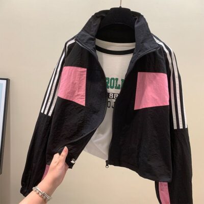 Màu sắc tương phản áo khoác ngắn mỏng của phụ nữ mùa xuân và mùa hè 2023 thắt lưng mới cổ đứng áo khoác bóng chày đồng phục thời trang nối quần áo chống nắng