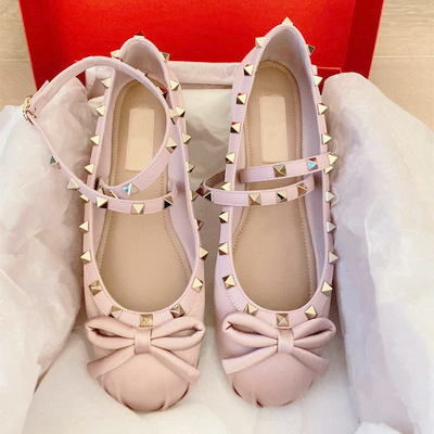 Khóa chéo giày ba lê nữ mùa hè và mùa thu 2023 mới nơ đinh tán cổ tích satin đáy phẳng miệng nông giày đơn