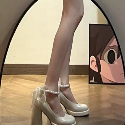Mary Jane giày đơn nữ mùa xuân và mùa thu 2023 phong cách cổ tích mới thiết kế cảm giác thời trang ngọc trai gót chunky với váy giày cao gót