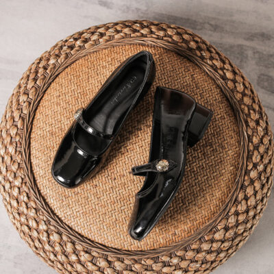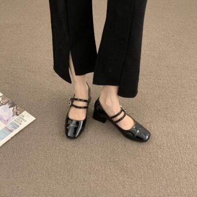 Giày bà búi tóc thơm toàn da đầu xuân 2023 mới gót thấp màu gió nhỏ thơm giày một từ giày da nhỏ nữ
