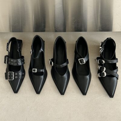 Mùa Xuân Năm 2023 Mới Phiên Bản Hàn Quốc Miệng Dẹt Đáy Bằng Nữ Thắt Lưng Hích Thiết Kế Mũi Nhọn Đinh Tán Giày Đơn