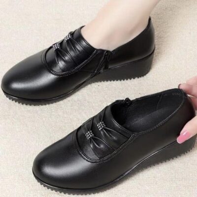 Giày bà ngoại mũi vuông bằng da gót thấp đi lại Giày da nữ đế dày mũi nông giày đơn mùa thu phù hợp với mọi lứa tuổi Giày lười thoải mái