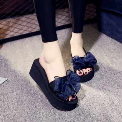 Phiên bản Hàn Quốc của xăng đan và dép lê nêm thắt nơ nữ dép đi trong nhà mùa hè xuyên biên giới dép xỏ ngón đế dày mặc bên ngoài nêm chống trượt của phụ nữ