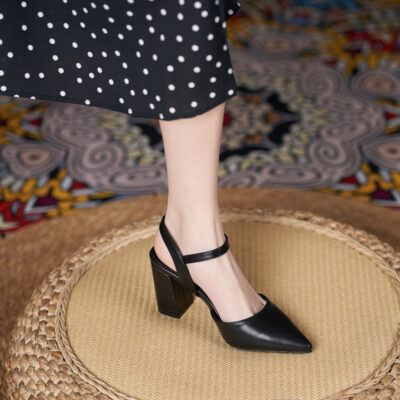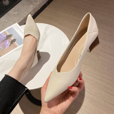 Giày nữ một mảnh thay mặt giày da nữ phong cách Pháp mùa hè 2023 gót dày miệng nông mũi nhọn gót vừa giày cao gót đơn