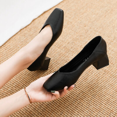 Giày đơn gót dày bề mặt da nữ mùa thu 2023 mới phù hợp với đầu vuông giày nữ đế mềm giày bà nhẹ nhàng da mềm nữ