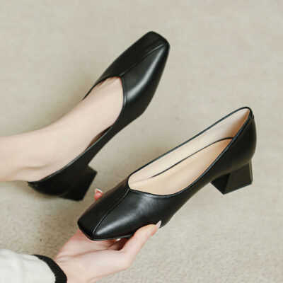 Giày cao gót đế dày giày bốn mùa mới 2023 giày nữ da thật mũi vuông miệng nông gót giữa đi lại giày da mềm phù hợp với mọi lứa tuổi