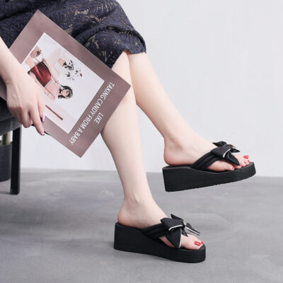 Phiên bản Hàn Quốc của xăng đan và dép lê nêm thắt nơ nữ dép đi trong nhà mùa hè xuyên biên giới dép xỏ ngón đế dày mặc bên ngoài nêm chống trượt của phụ nữ
