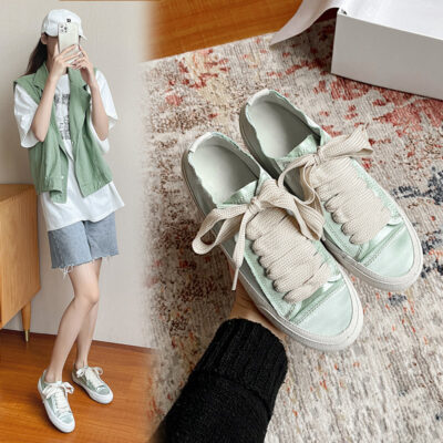 sheii Su Yinyin] Cherry Blossom Street ~ Đầu tròn Hàn Quốc thật lụa satin đáy dày buộc dây giày thường giày thể thao nữ