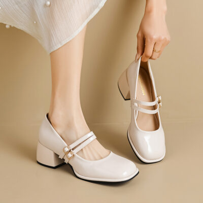 Thắt lưng khóa một từ Mary Jane mũi vuông giày đơn gót dày giày nữ 2023 mới giày nhỏ gót vừa màu đỏ da sáng
