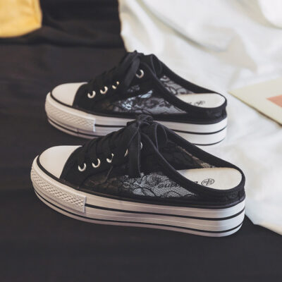 Ren Tăng Chiều Cao Giày Vải Nữ Mùa Hè 2023 Thoáng Khí Bao Đầu Mang Nửa Dép Không Gót Đáy Dày Giày Trắng Nhỏ