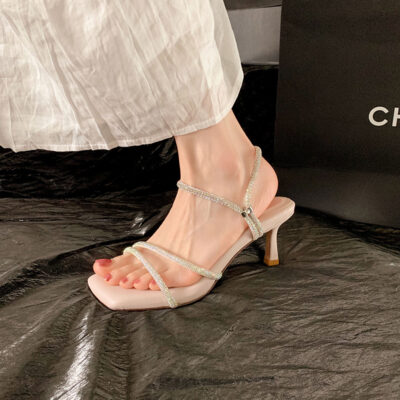 Xăng-đan cao gót khí chất người nổi tiếng thời trang mùa hè đầu vuông đính kim cương giả cao cấp kiểu Pháp xăng-đan buổi tối và dép đi trong nhà