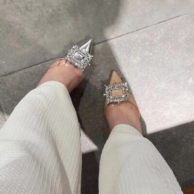 Xăng đan cao gót đính đá pha lê mũi nhọn giày cao gót nữ gót nhọn kèm váy năm cổ tích dép xăng đan áo khoác ngoài nữ