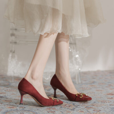 6368-5 Pháp Retro Mờ Da Lộn Giày Đơn Màu Đỏ Rượu Ngọt Nơ Gió Giày Cao Gót Giày Cô Dâu Giày Cưới