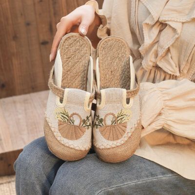2023 spot giày thêu nữ phong cách dân tộc mới có thể mang bên ngoài dép bệt đế giữa bằng vải lanh các nhà sản xuất giày đơn nữ