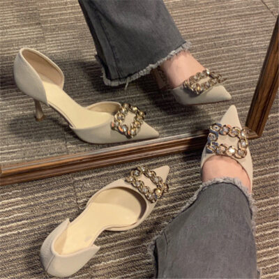228-2 Mũi Nhọn Đế Mùa Xuân 2023 Mới Vuông Khóa Lớn Kim Cương Giả Pháp Rỗng Đĩa Đơn Giày Xăng Đan Cao Gót