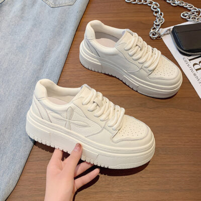 Giày bánh quy đế dày nữ da bò nguyên miếng giày nhỏ màu trắng tăng bình thường đế thấp đế bằng bánh xốp thể thao đáy nho mẹ da thật