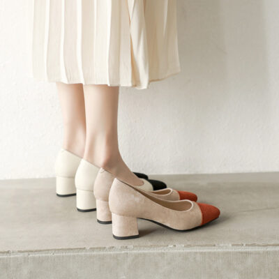 Giày cao gót cỡ trung dành cho nữ mùa xuân 2023 giày công sở dày gót lưới màu đỏ thoải mái da bò mũi tròn giày thường