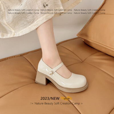 Điểm giày cao gót mũi tròn của trường đại học Pháp giày cao gót nữ đi lại khóa ngọc trai một từ với đáy dày gió đêm Mary Jane