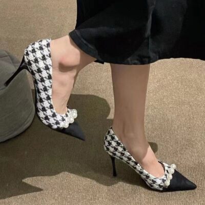 Giày cao gót Houndstooth giày cao gót nữ thanh lịch xuân thu 2023 khí chất mới chuỗi ngọc trai giày mũi nhọn vải co giãn