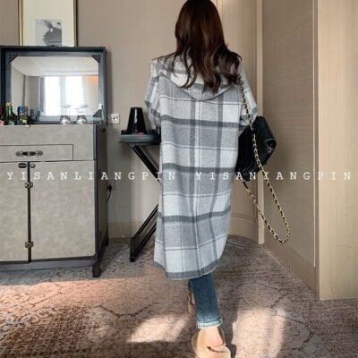 Phiên bản Hàn Quốc Áo khoác cashmere kẻ sọc hai mặt có mũ trùm đầu dành cho nữ có độ dài trung bình giảm tuổi Áo khoác len Úc mùa thu đông