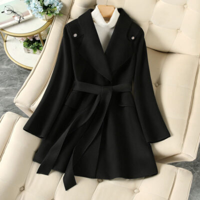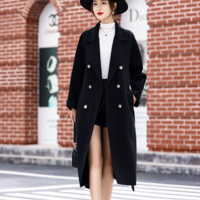 Mùa Đông Dài Buộc Dây Áo Khoác Len Nữ Đen 2 Mặt Áo Khoác Len Len Cao Cấp Áo Khoác Len Bán Buôn