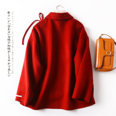 Áo khoác len đỏ lễ hội len hai mặt nữ mùa thu đông áo khoác len hai mặt nhỏ